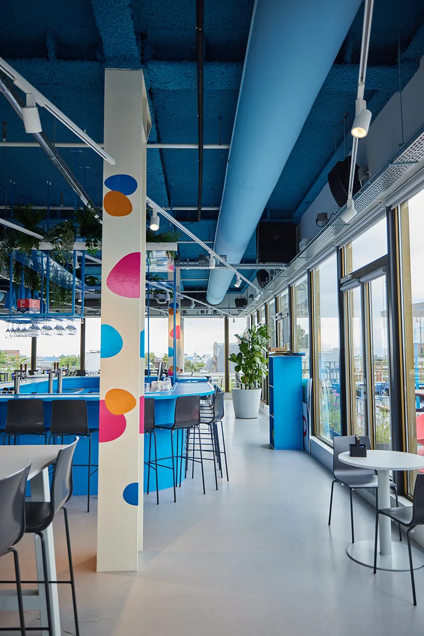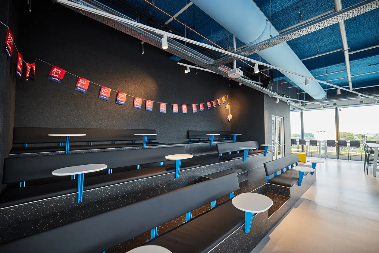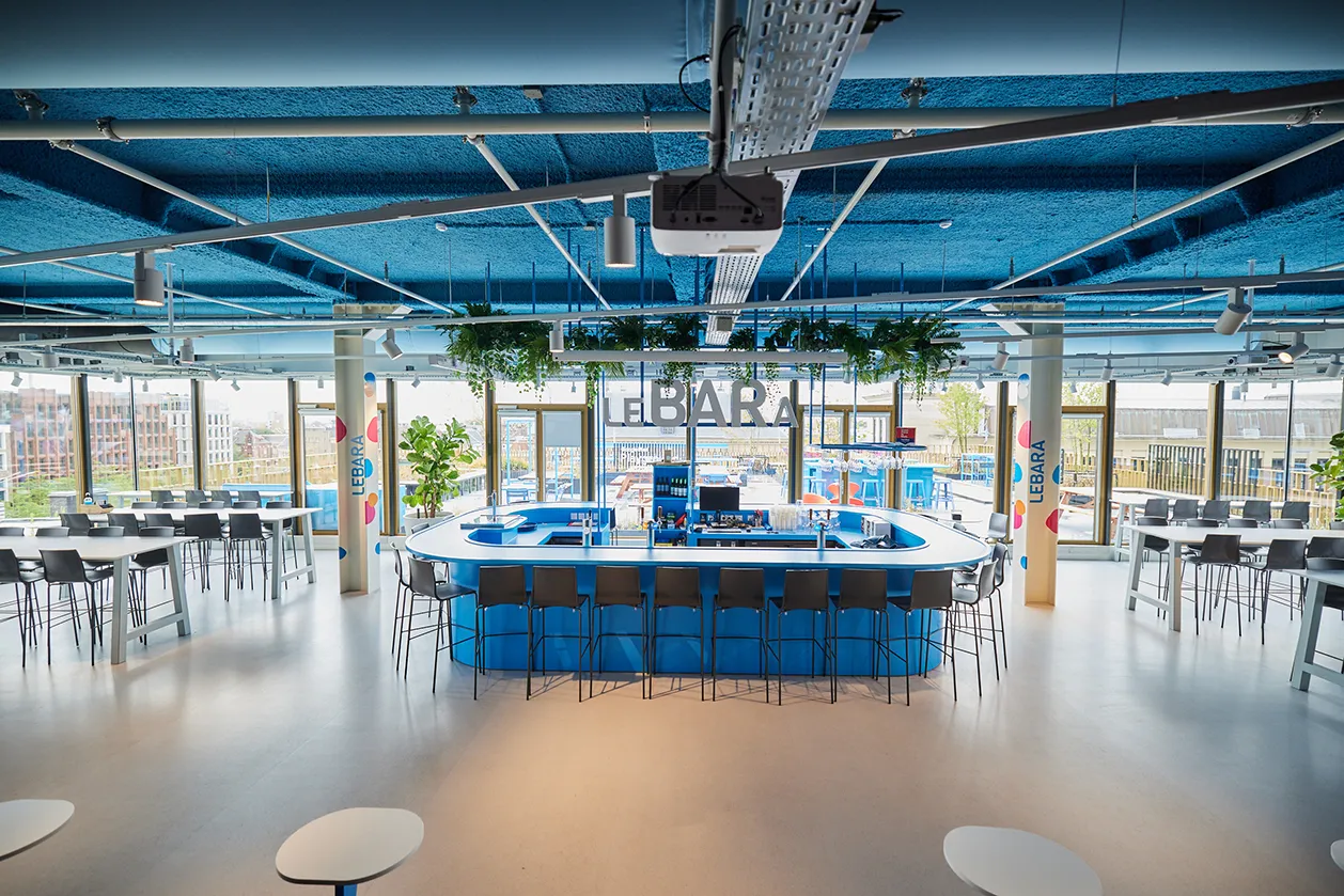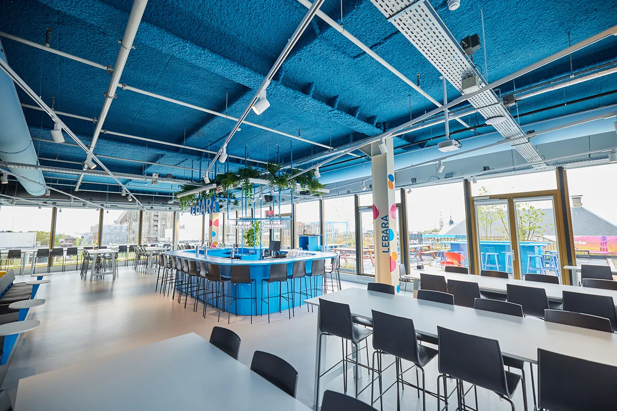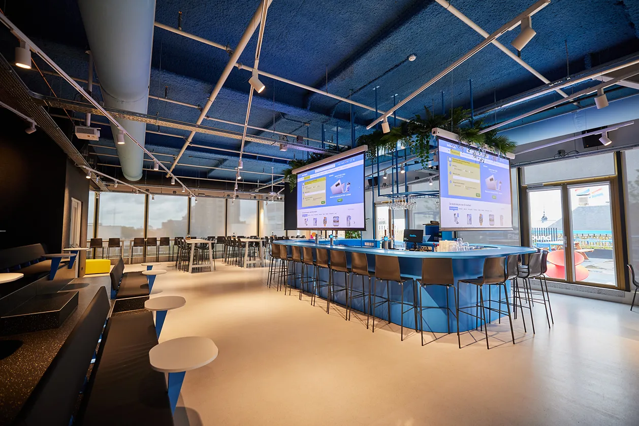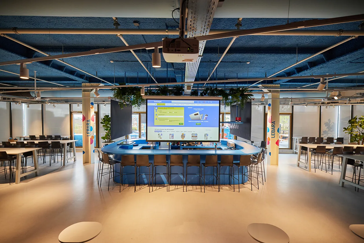 Maar daar hield het niet op. Voor grotere bedrijfsbijeenkomsten hebben we rondom de bar drie gekoppelde projectieschermen geplaatst. Hierdoor zijn presentaties goed zichtbaar, ongeacht waar je in de kantine zit. Dit maakt de ruimte niet alleen geschikt voor gezelligheid en ontspanning, maar ook ideaal voor professionele bijeenkomsten.